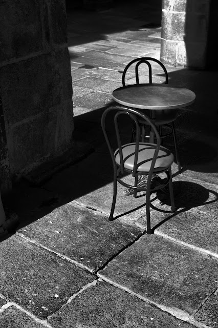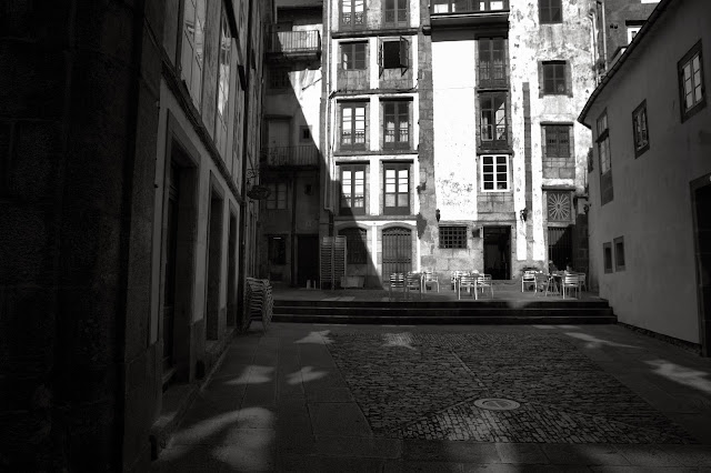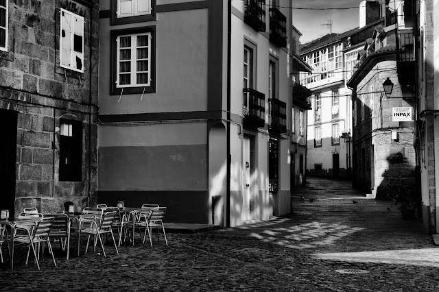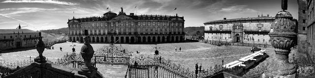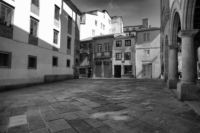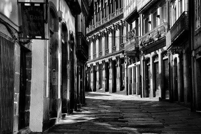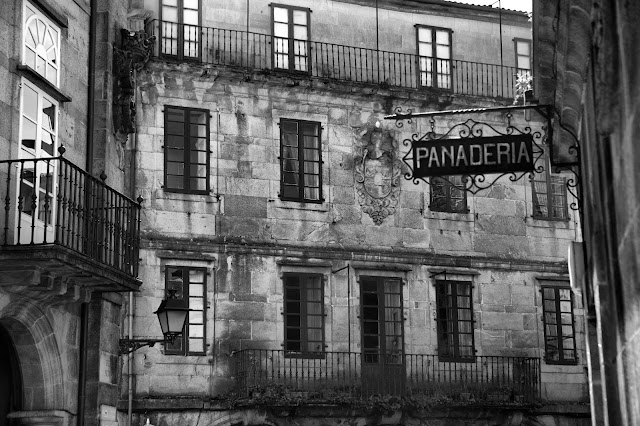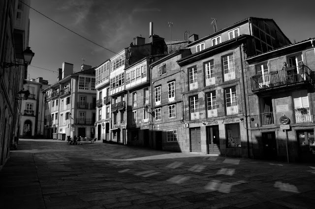 Intenso blanco y negro en las piedras de Compostela. Ese detalle en horizontal de la fachada del Obradoiro, los carteles de las tiendas, los tejados, las plazas, ...bañadas de luz de sol me han gustado muuuucho.